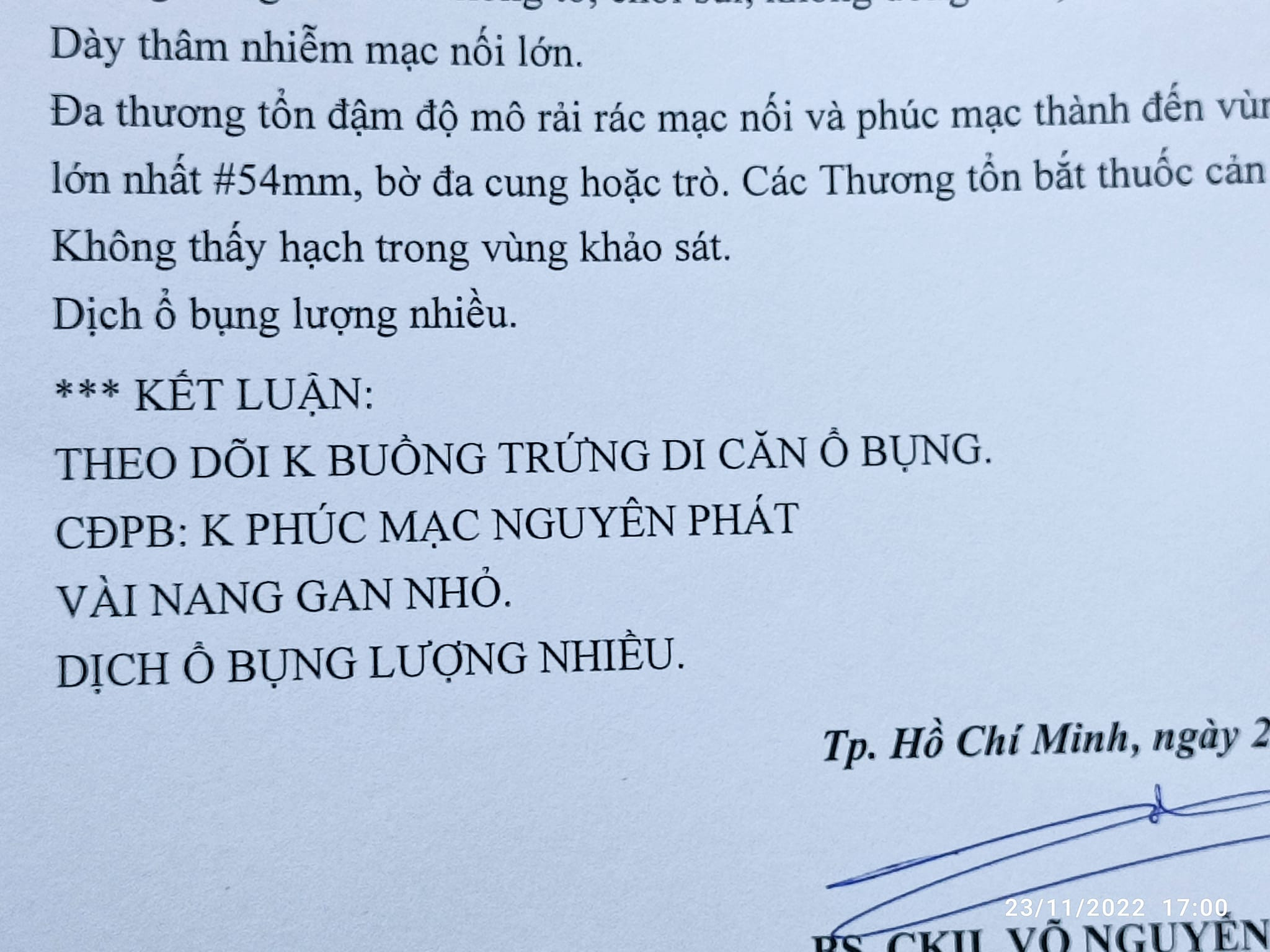 Sau một thời gian không thấy hiệu quả, bệnh nhân mới được người nhà đưa tới trung tâm khám bệnh. Kết quả khiến bệnh nhân bất ngờ đó là ung thư buồng trứng di căn ổ bụng, tràn dịch ổ bụng và khối u di căn cả lên gan. Các bác sĩ chuyển bệnh nhân sang Bệnh viện Ung bướu để tiếp tục theo dõi điều trị.