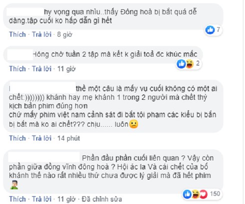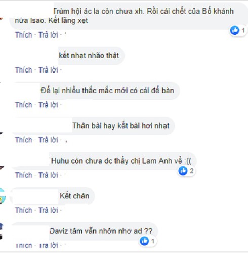 Khán giả bức xúc vì kết phim chưa làm sáng tỏ hết những nghi vấn. Những nhân vật: Anh Bá, mẹ Khánh, David Tâm, Đồng Vĩnh, Đông Hòa, Hội Ác La,... vẫn bị bỏ ngỏ |