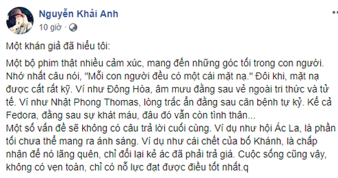 Trong chia sẻ, đạo diễn bộ phim cảm thấy đồng cảm với bình luận của khán giả. Bộ phim mang đến những góc tối trong con người. Một số vấn đề sẽ buộc chúng ta phải chấp nhận rằng sẽ không có câu trả lời cuối cùng.