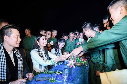 Hoa hậu Ngọc Hân, Ca sĩ Xuân Hảo, và Á hậu Huyền My chụp ảnh với các chiến sỹ. |