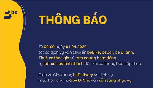 Cũng trong đêm qua, hãng taxi công nghệ Be ra thông báo tạm dừng một số dịch vụ từ 0h ngày 1/4/2020. Các dịch vụ vận chuyển như beBike, beCar, thuê theo giờ, be đi tỉnh sẽ tạm dừng phục vụ tại tất cả các tỉnh thành mà Be đang hoạt động. Như vậy, có thể thấy Be tạm dừng cung cấp cả dịch vụ xe ôm công nghệ beBike từ hôm nay.