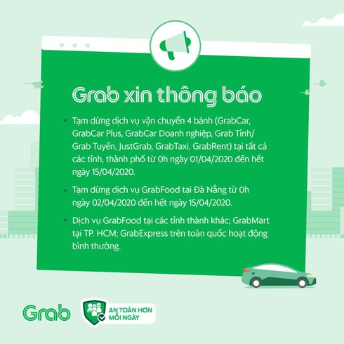 Theo đó, vào đêm qua, Grab thông báo tạm dừng cung cấp toàn bộ các dịch vụ vận chuyển 4 bánh (GrabCar, GrabCar Plus, GrabCar Doanh nghiệp, Grab Tỉnh/Grab Tuyến, GrabTaxi, GrabRent) tại tất cả các tỉnh, thành phố từ 0h ngày 1/4/2020 đến hết ngày 15/4/2020.