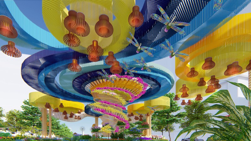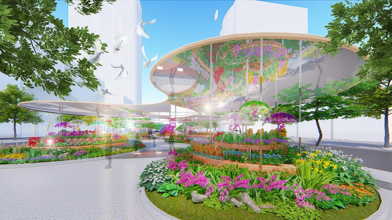 Đại cảnh Vườn Lan Xuân năm nay sẽ mang một hiệu ứng hoàn toàn mới nhờ vào mái aluminium gương, tạo sự tương phản hình ảnh với giàn lan tầng cao, tầng thấp bên dưới.