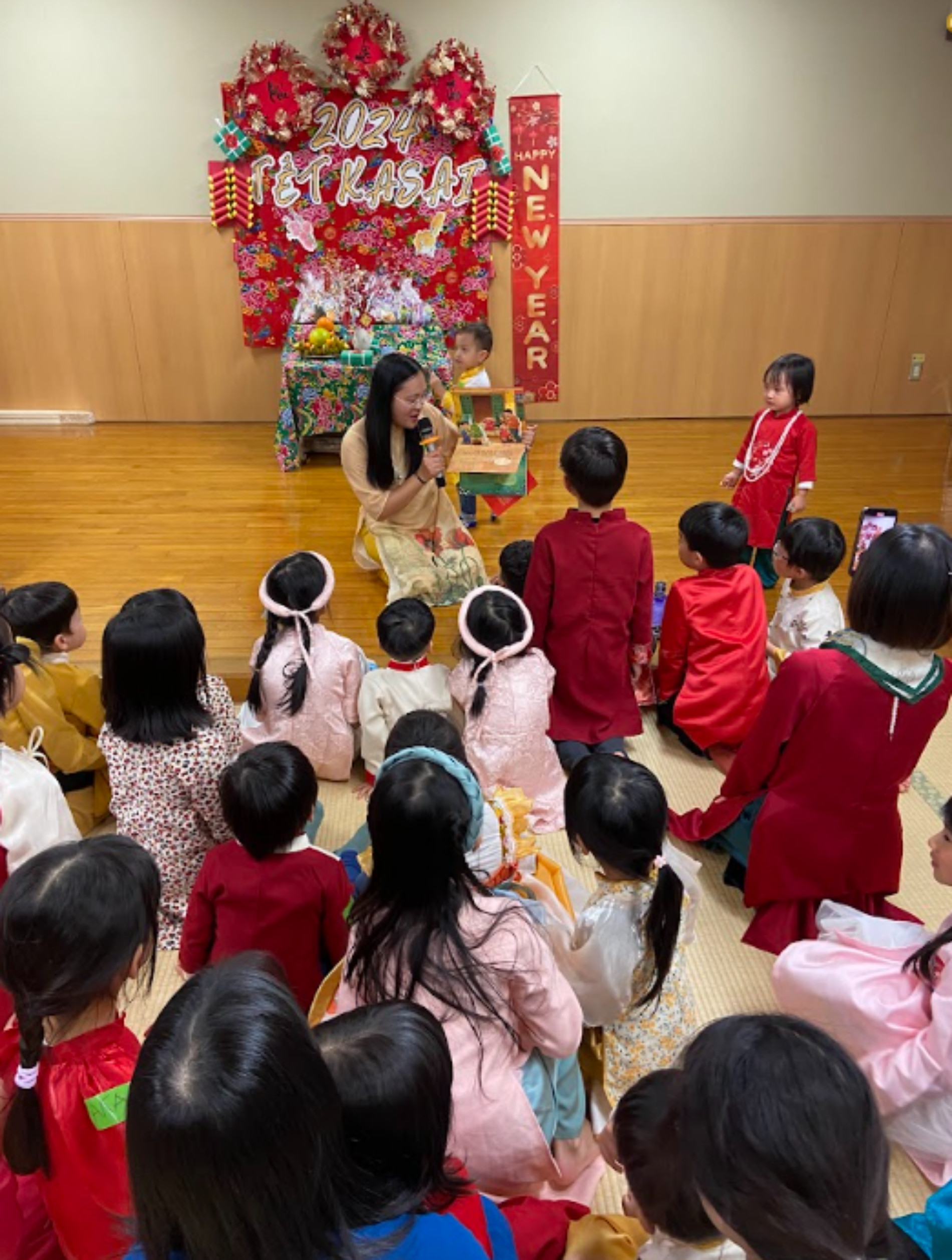 Tuy nhiên, sự xuất hiện của gần 100 người, bao gồm người lớn và các bé nhỏ xúng xính trong bộ áo dài truyền thống khiến hội trường thật náo nhiệt, không khác gì ngày mùng 1.