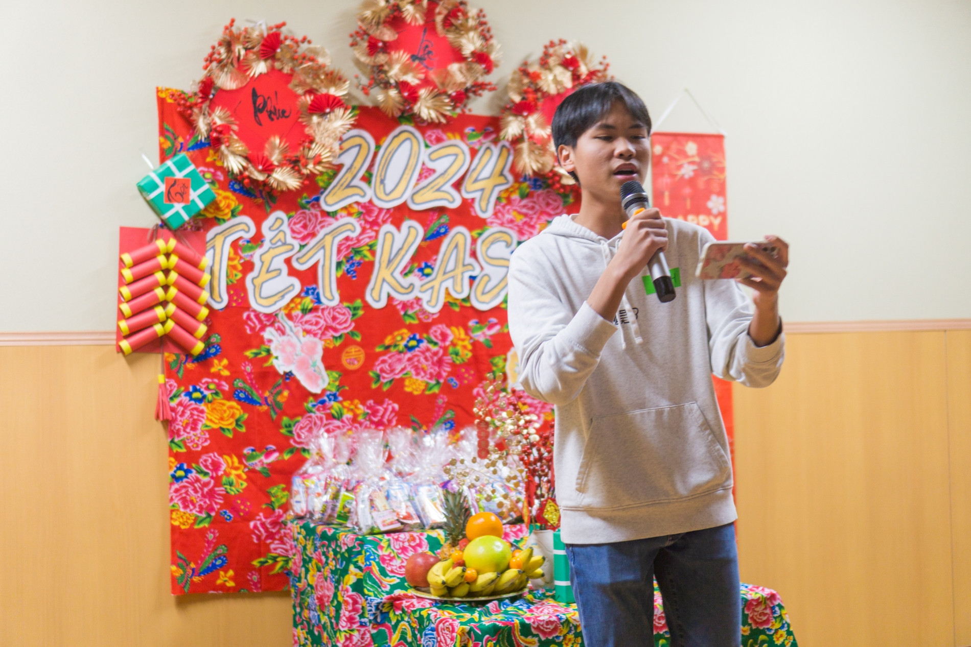 Bộ phận phụ trách trang trí sân khấu đã tự làm mô hình bánh chưng, tràng pháo, chuẩn bị mâm ngũ quả, quà tặng lì xì cho các bé… Nhóm nhận nhiệm vụ lo phần tiệc nhẹ cũng cố gắng chăm chút từng đĩa bánh kẹo, mứt Tết… Phần hình ảnh, âm nhạc vô cùng chỉn chu.