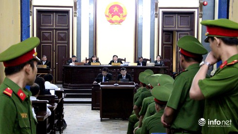 Vành móng ngựa đã không còn trong phiên tòa xét xử này, thay vào đó các bị cáo đứng trình bày trước một chiếc bàn nhỏ. Thư ký phiên tòa cũng không còn ngồi bên trái HĐXX mà chuyển xuống ngồi ngay phía trước. |