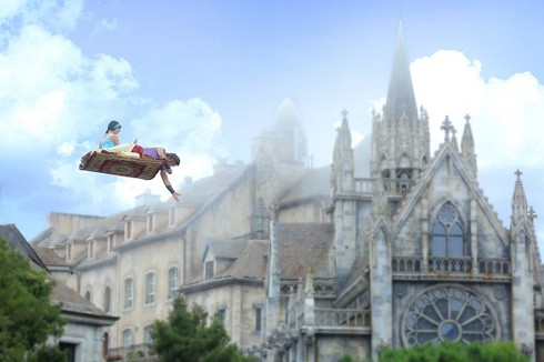 Ngỡ ngàng hơn nữa là hình ảnh chàng Aladdin cưỡi thảm kì diệu bay trên không trung, vượt qua cả những mái vòm của những tòa lâu đài để tìm kiếm nàng công chúa Jasmine xinh đẹp.