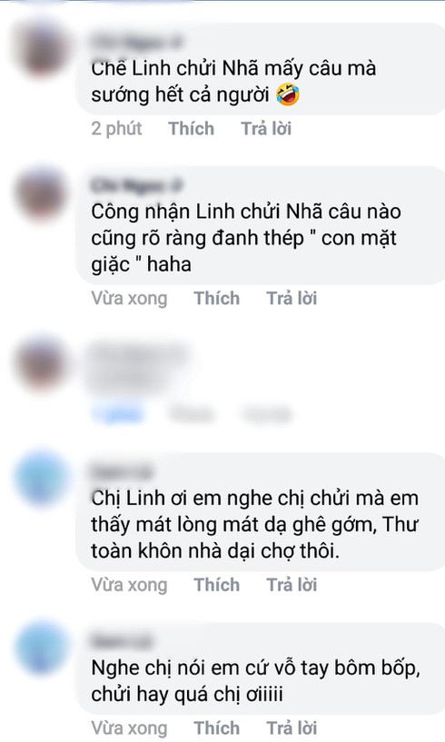Khán giả chỉ biết phấn khích vỗ tay trước những câu nói "chuẩn không cần chỉnh" của Linh. Một khán giả phấn khích chia sẻ: “Chị Linh ơi, em nghe chị chửi mà em thấy mát lòng mát dạ ghê gớm, Thư toàn khôn nhà dại chợ thôi”.