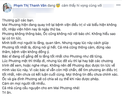 Sáng nay, khán giả và nghệ sĩ đã lo lắng không ngừng khi nghe tin nữ diễn viên Mai Phương lại phải nhập viện vì có một số biểu hiện xấu từ căn bệnh ung thư phổi. Chính người bạn thân Ốc Thanh Vân đã đăng đàn lên trang cá nhân để trấn an mọi người, mong rằng khán giả đừng vào bệnh viện để tránh tình trạng xáo trộn và ảnh hưởng đến quá trình làm việc của các bác sĩ. |