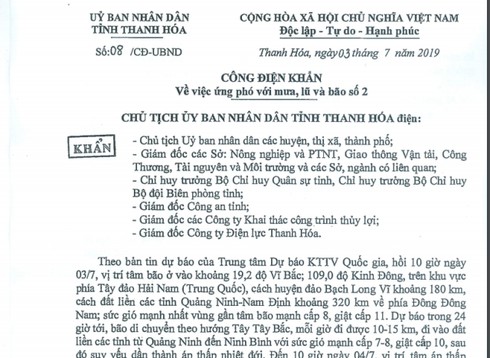 Ngày 3/7, UBND tỉnh Thanh Hóa ra công điện khẩn số 08/CĐ-UBND gửi Chủ tịch UBND các huyện, thị, thành phố; Giám đốc các Sở NN&PTNT, GTVT, TN&MT, Công Thương, Chỉ huy trưởng Bộ Chỉ huy Quân sự tỉnh, Chỉ huy trưởng Bộ đội Biên phòng, Giám đốc Công an tỉnh... và các ngành liên quan chủ động ứng phó với bão số 2.