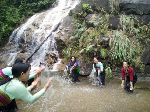 Nhiều cô gái thích thú vui đùa dưới thác |