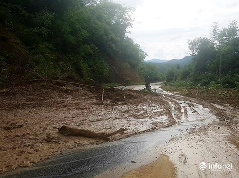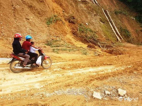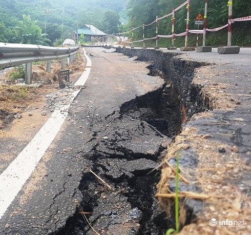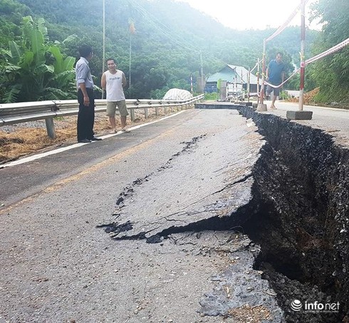 Sáng 17/7, sau khi cơn bão số 2 (Talas) càn quét qua, người dân bất ngờ thấy xuất hiện 1 vết nứt trên đường kéo dài và sụt lún sâu về phía vực trên QL 217.