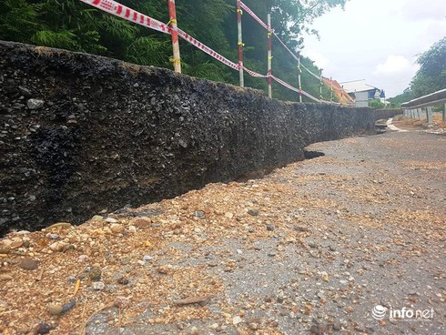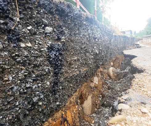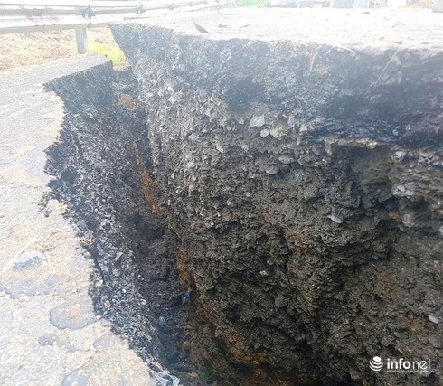 Theo ghi nhận của PV Infonet tại hiện trường, vết nứt toác, sụt lún kéo dài khoảng 70m, bề rộng vết nứt 30-50cm, độ sâu hơn 1m, nhiều mảng đường nhựa bị bong tróc ra.
