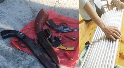 Qua kiểm tra tại chỗ, lực lượng Công an phát hiện bên trong có 4 khẩu súng tự chế (2 khẩu côn quay, 2 khẩu săm lét) cùng một số viên đạn, nhiều típ sắt tại hiện trường…