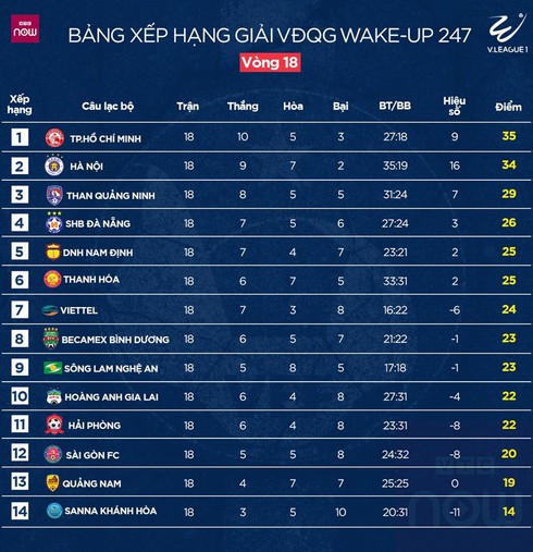 BẢNG XẾP HẠNG V.LEAGUE 2019 VÒNG ĐẤU THỨ 18.Ảnh: VTC |