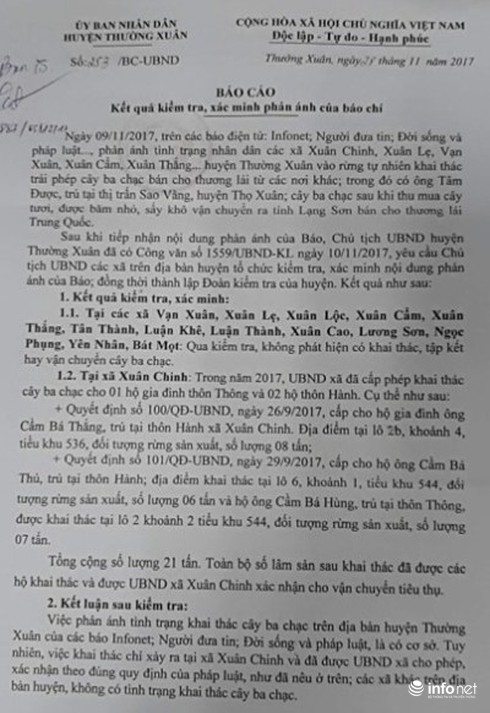 Việc phản ánh việc khai thác cây Ba chạc là có cơ sở và tại xã Xuân Chinh đã được UBND xã cấp phép cho khai thác.