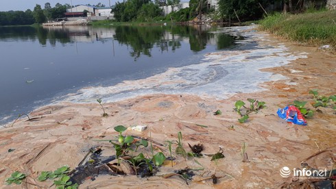 Những vệt váng màu vàng xám nổi trên mặt nước dọc bờ sông có mùi hôi, tanh khó chịu. |