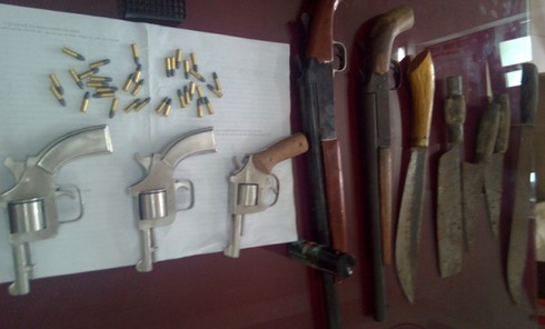 Khám xét nơi ở của các đối tượng, Công an thu giữ 5 khẩu súng tự chế (gồm 2 súng bắn đạn ria, 3 khẩu súng côn quay tự chế), các loại súng này được giám định tính năng và tác dụng như súng quân dụng và nhiều dao kiếm các loại.