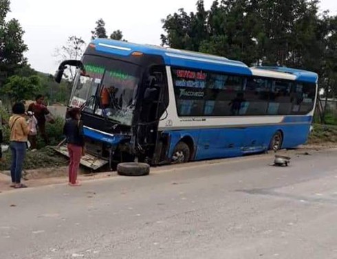Tại hiện trường, chiếc xe 7 chỗ bị biến dạng hoàn toàn, lốp, vành xe văng khắp nơi. Còn xe khách lao xuống mương thoát nước, kính bị vỡ, hư hỏng phần đầu.