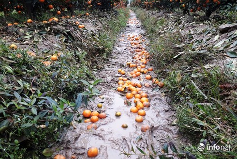 Nhiều người dân có mặt tại vườn quất vô cùng xót xa khi chứng kiến hàng trăm triệu đồng cũng như công sức bao năm đổ xuống sông, xuống biển.