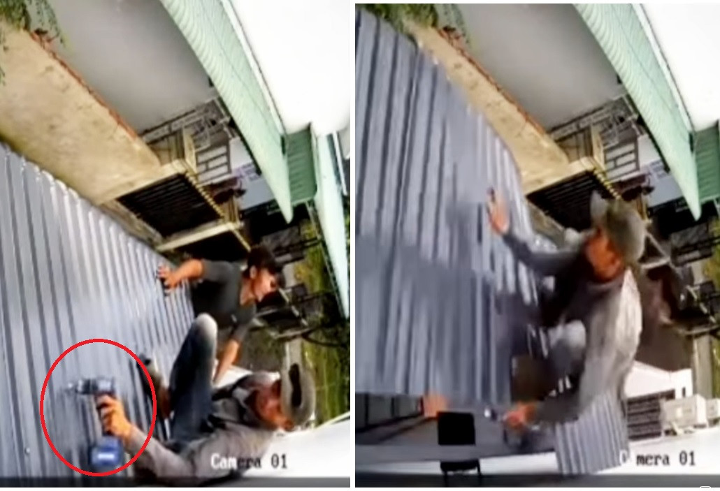 Camera an ninh nhà dân đã ghi lại được tình huống tai nạn lao động xảy ra vào 16h50' chiều 29/9/2022. Theo đó, hai thanh niên đang bắn mái tôn vào bên hông một ngôi nhà kiên cố thì tai nạn xảy ra.