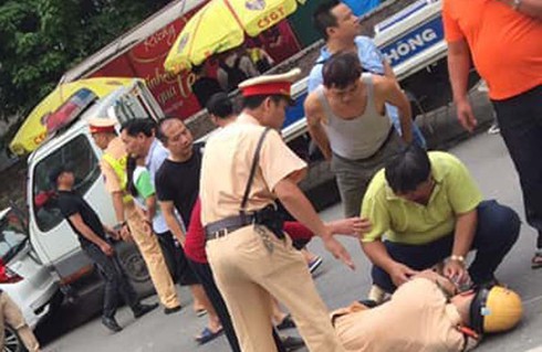 Chiến sĩ CSGT bị nam thanh niên điều khiển xe máy tông gục. |