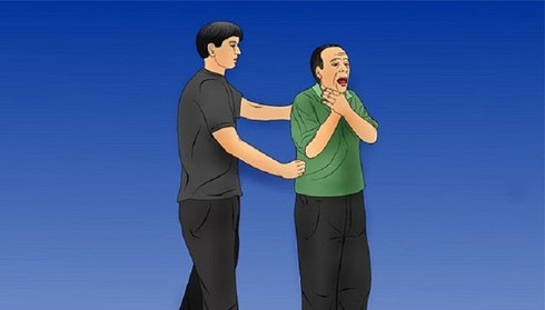 Bác sĩ Sầm cho biết thao tác Heimlich tát thật mạnh vào lưng, ngực 5 lần kết hợp ép đẩy bụng lên trên đột ngột 5 lần. |