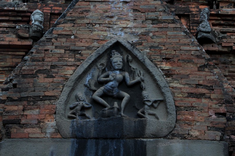 Trên vòm cửa là tấm phù điêu bằng đá hình lá đề thể hiện thần Shiva với bốn cánh tay đang múa, hai bên có hai nhạc công thổi sáo, chân phải Shiva đặt trên lưng bò thần Nandin. Phù điêu có niên đại thế kỷ XI và là một trong những tấm phù điêu đẹp nhất của văn hóa Chăm pa còn được lưu giữ ở Việt Nam. |