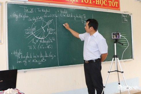 Thầy Quý còn dùng 1 chiếc điện thoại thông minh có giá đỡ, kết nối với mạng Internet để livestream trên trang facebook cá nhân toàn bộ bài giảng của mình cho từng nhóm, lớp.