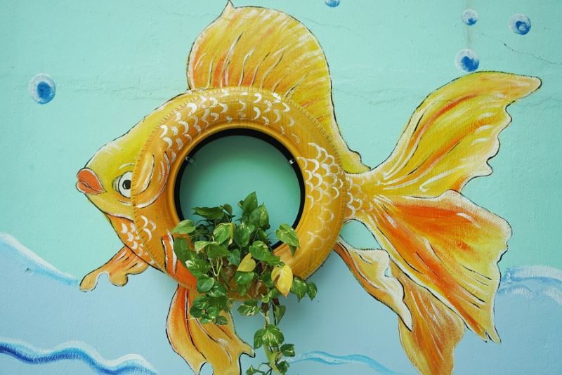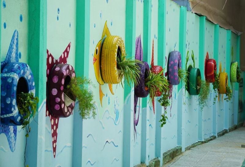 Hình ảnh chú cá được thầy Thanh dùng lốp xe vẽ màu, trồng cây xanh tạo điểm nhấn