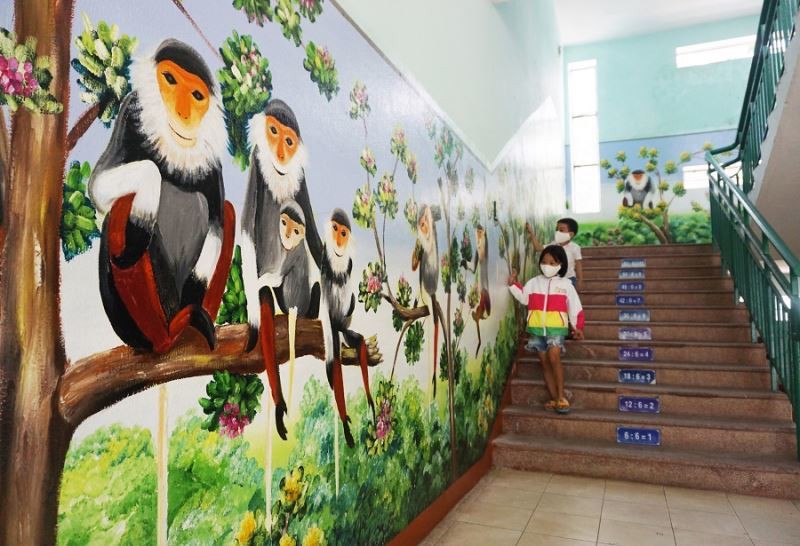 Hai cầu thang lên xuống của trường, thầy Thanh vẽ những đàn voọc chà vá chân nâu sống trên bán đảo Sơn Trà…