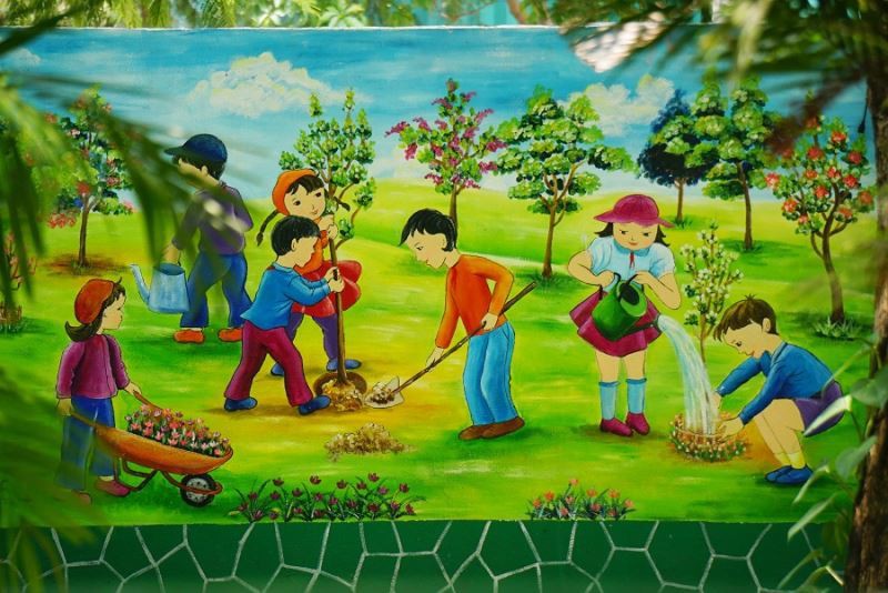 Bức tranh khích lệ học sinh bảo vệ môi trường, trồng cây xanh được thầy Thanh vẽ trước cổng trường