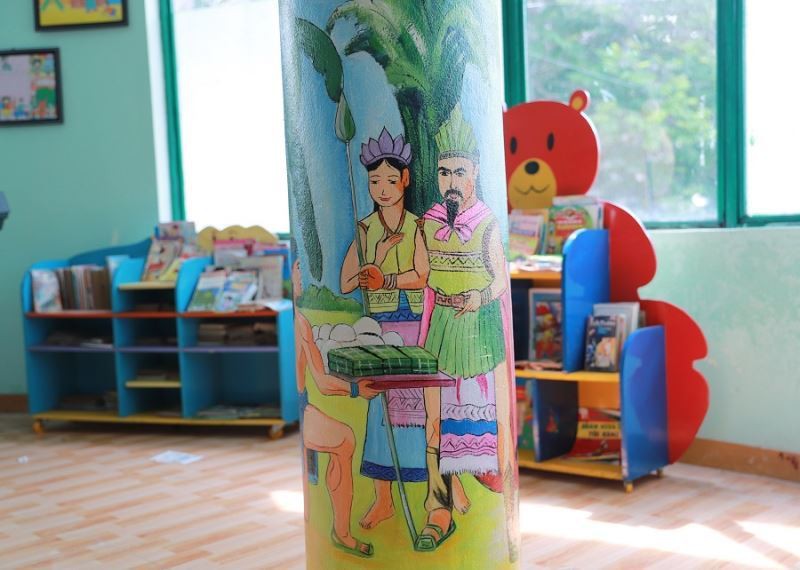 Trong phòng thư viện, cửa phòng học, tiền sảnh được thầy vẽ nhân vật các câu chuyện cổ tích, hoa, con vật..