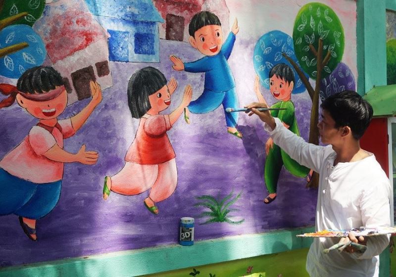 Qua mỗi bức tranh, thầy muốn truyền tải từng thông điệp riêng đến học sinh đó là các trò chơi dân gian như trốn tìm, nhảy dây, ô ăn quan… hay trồng cây xanh bảo vệ môi trường…