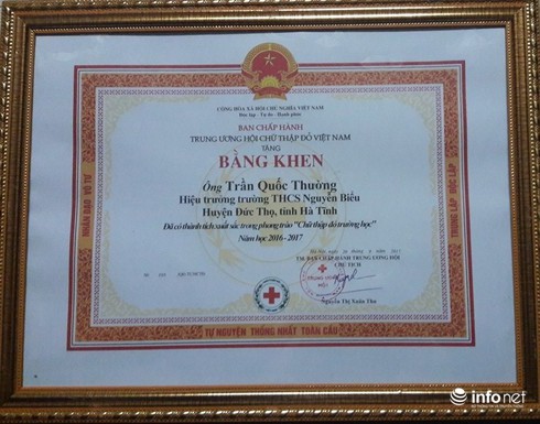 Với những đóng góp của mình, thầy Trần Quốc Thường được Trung ương Hội Chữ thập đỏ Việt Nam tặng Bằng khen. |