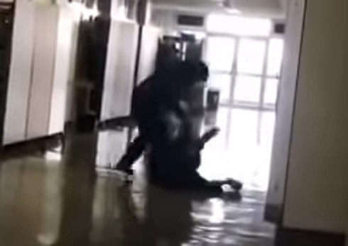 Câu trả lời của người giáo viên không nghe được rõ vì học sinh nói rất nhiều và rất to. Cuối cùng, tình huống khiến nhiều người bất ngờ khi giáo viên đột ngột tiến về phía nam sinh, vung tay đám ngã học sinh xuống sàn sau đó túm lấy bằng một tay.