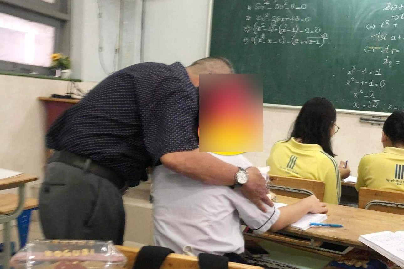 Theo hình ảnh được chia sẻ trên mạng xã hội, trong lúc cả lớp đang học bài, thầy giáo đứng tuổi đã vòng tay phía sau ôm và có hành vi không chuẩn mực với nữ sinh.