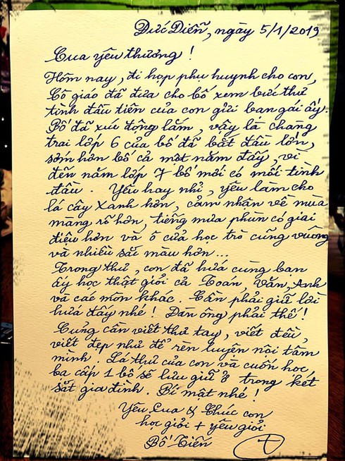 Cũng cần viết thư tay, viết đều viết đẹp như để rèn luyện nội tâm mình. Lá thư của con và cuốn học bạ cấp 1 bố sẽ lưu giữ ở trong két sắt gia đình. Bí mật nhé!