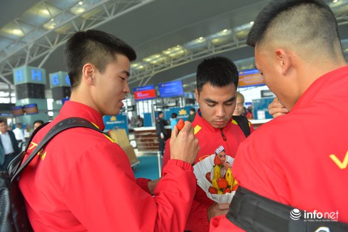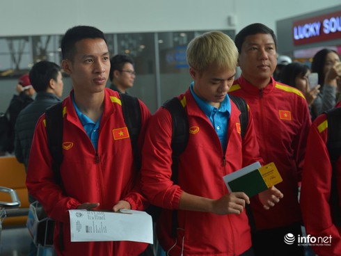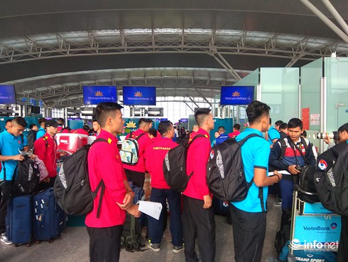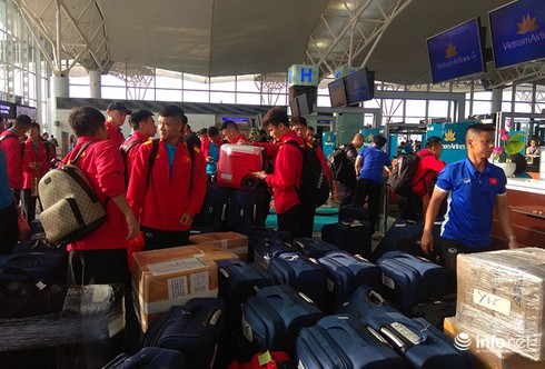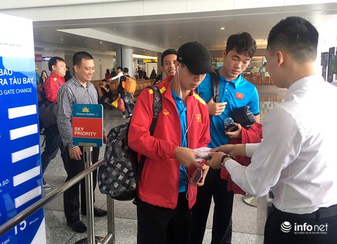 Từ rất sớm, Đội tuyển bóng đá Việt Nam đã có mặt tại Sân bay quốc tế Nội Bài làm thủ tục lên chuyến bay. |