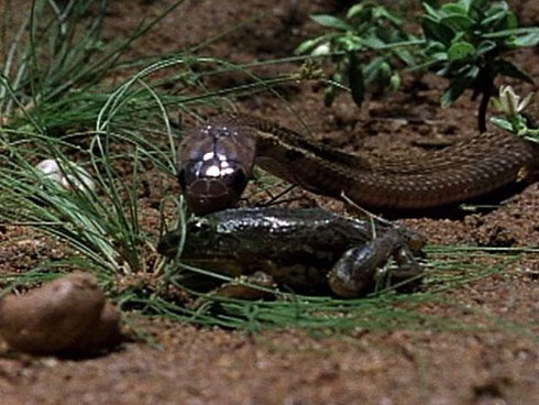Đi thêm một quãng, rắn hổ mang con phát hiện con ếch thứ 2 và đây chính là mục tiêu của nó. Nó nhanh chóng bao quanh con mồi, rồi nhanh như chớp tung đòn tấn công con mồi.