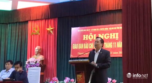 Ông Nguyễn Trung Châu - Trưởng Ban Tuyên giáo Thành ủy Vinh phát biểu tại Hội nghị giao ban báo chí Nghệ An định kỳ tháng 11. |