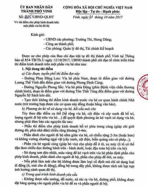 Công văn của UBND TP. Vinh về việc thí điểm cho phép kinh doanh trên một phần vỉa hè đô thị. |