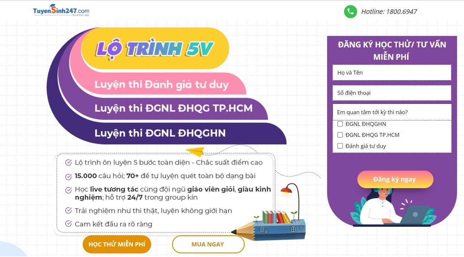 Trang web tuyensinh247.com cũng đưa ra các khóa luyện thi đánh giá năng lực, đánh giá tư duy với giới thiệu “chắc suất điểm cao”.