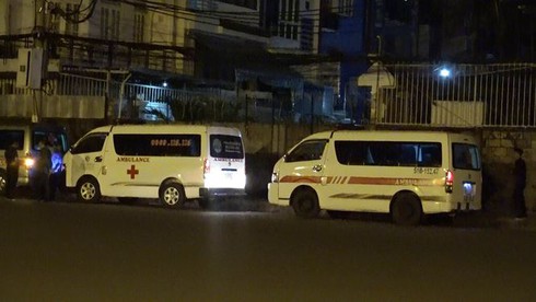 Ba xe cứu thương được chuẩn bị để chở thi thể các nạn nhân về gia đình lo hậu sự. |