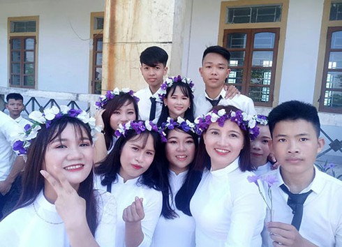 Chị Minh chụp ảnh chung với các bạn tại Trung tâm giáo dục thường xuyên thị xã Hồng Lĩnh. (Ảnh: NV cung cấp) |