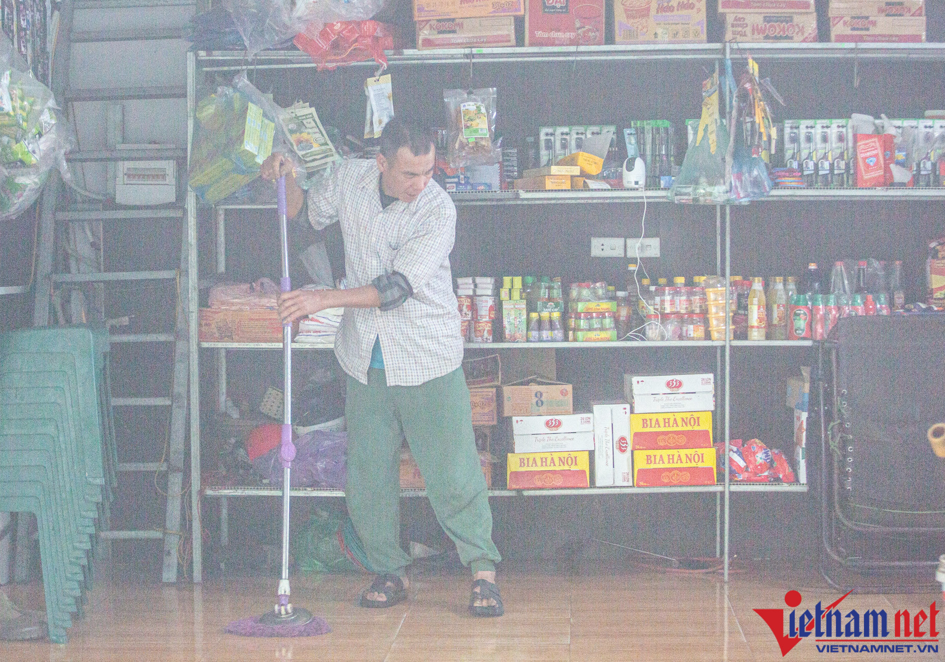 “Cứ 10 phút, hai vợ chồng lại phải thay nhau lau nhà, vì những ngày này trời nồm, sàn nhà thường xuyên ẩm ướt”, ông Thưởng nói.
