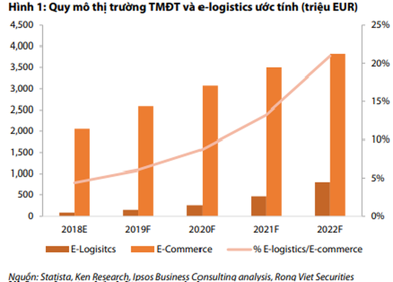 Với sự bùng nổ này, nhu cầu về logistics trong hệ sinh thái TMĐT (e-logistics) là rất lớn. Theo ước tính của hãng nghiên cứu thị trường Ken Research, quy mô của thị trường logistics này được ước tính có giá trị 90 triệu EUR vào năm 2018 và được dự báo sẽ đạt mức tăng trưởng trung bình 42% mỗi năm cho đến năm 2022.