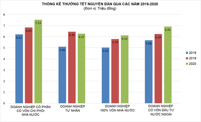 Khoảng 89,3% doanh nghiệp báo cáo có thưởng Tết Nguyên đán 2020 với mức bình quân khoảng 1 tháng lương (6,71 triệu đồng/người), tăng 7,1% so với thưởng dịp Tết Nguyên đán 2019, cụ thể: Công ty TNHH một thành viên 100% vốn Nhà nước 6,12 triệu đồng/người; Công ty cổ phần có vốn góp chi phối của Nhà nước 7,53 triệu đồng/người; Doanh nghiệp dân doanh 6,27 triệu đồng/người; Doanh nghiệp có vốn đầu tư nước ngoài 6,91 triệu đồng/người.