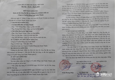 Thời điểm kiểm tra, Công ty CP Hồng Lam Xuân Thành đã lắp đặt 18 thùng sắt (container). Đoàn kiểm tra kết luận: “Công ty CP Hồng Lam Xuân Thành lắp đặt các thùng sắt (container) không đúng với hồ sơ cấp phép”.