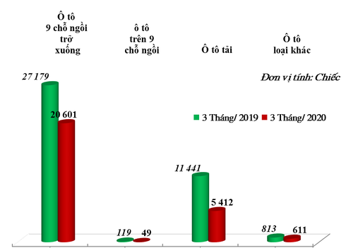 Như vậy, tính trong 3 tháng đầu năm 2020, lượng ô tô nguyên chiếc các loại đạt 26.637 chiếc, giảm 32,6% so với cùng kỳ năm trước. Trong đóô tô 9 chỗ ngồi trở xuống là 20.601 chiếc, giảm 24,2%; ô tô vận tải là 5.412 chiếc, giảm 52,7%.